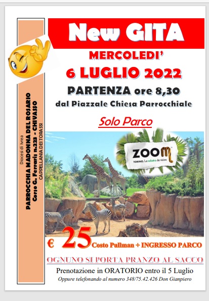 GITA a ZOOM Mercoledì 6 Luglio PARTENZA ore 8,30 dal Piazzale Chiesa Parrocchiale Condividi: Fai clic per condividere su X (Si apre in una nuova finestra) X Fai clic per condividere su Facebook (Si apre in una nuova finestra) Facebook Mi piace Caricamento... I commenti sono chiusi.