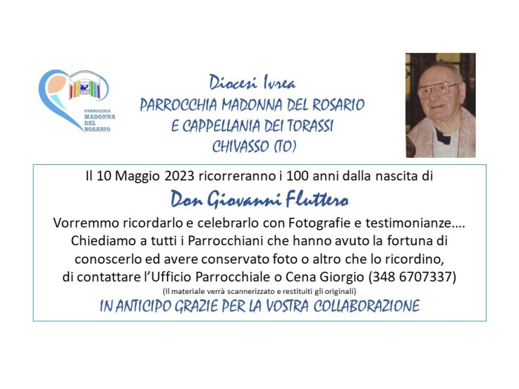 100 anni dalla nascita di Don Giovanni Fluttero – 10/05/2023 Vorremmo ricordarlo e celebrarlo con Fotografie e testimonianze…. Condividi: Fai clic per condividere su X (Si apre in una nuova finestra) X Fai clic per condividere su Facebook (Si apre in una nuova finestra) Facebook Mi piace Caricamento... I commenti sono chiusi.