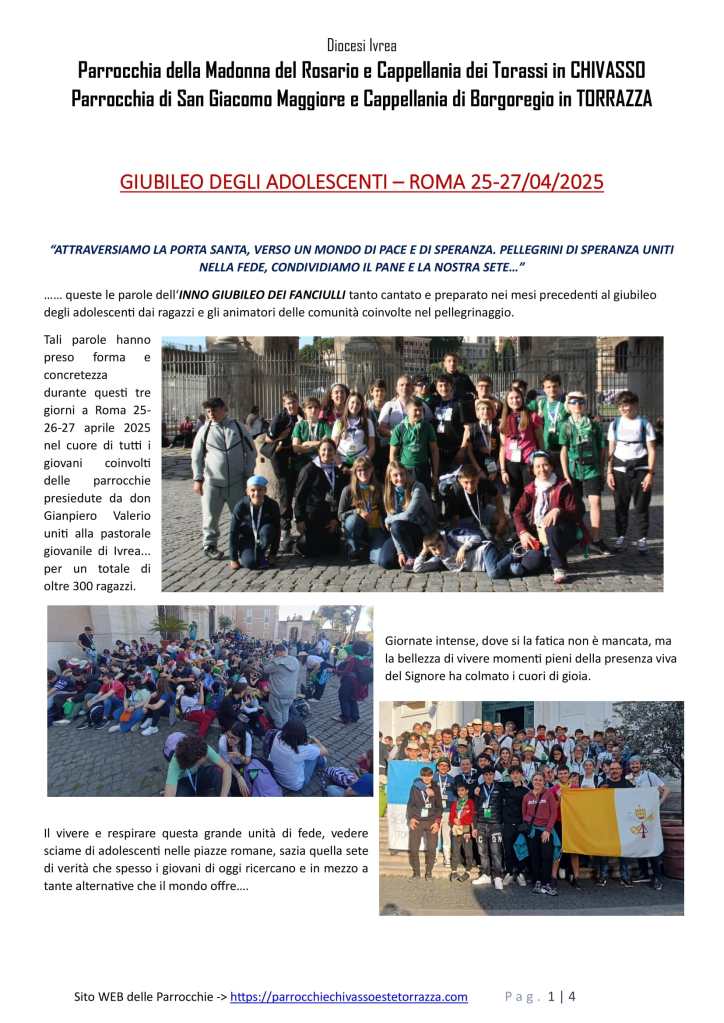 GIUBILEO DEGLI ADOLESCENTI – ROMA 25-27/04/2025 Giubileo Adolescenti – 2025Download Condividi: Fai clic per condividere su X (Si apre in una nuova finestra) X Fai clic per condividere su Facebook (Si apre in una nuova finestra) Facebook Mi piace Caricamento... I commenti sono chiusi.