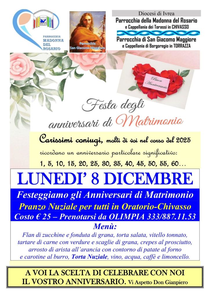 Solennità dell’ Immacolata 2025 e Anniversari di Matrimonio Condividi: Fai clic per condividere su X (Si apre in una nuova finestra) X Fai clic per condividere su Facebook (Si apre in una nuova finestra) Facebook Mi piace Caricamento... I commenti sono chiusi.
